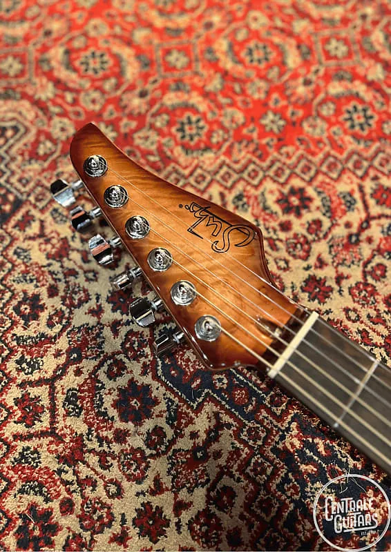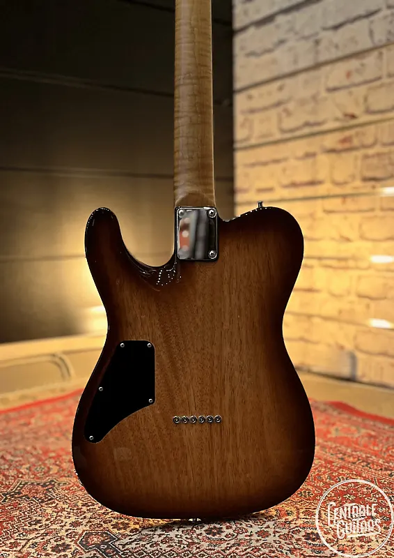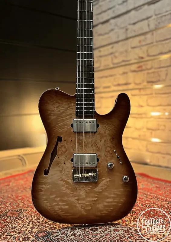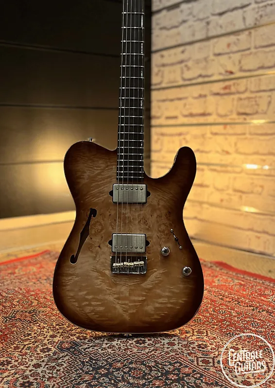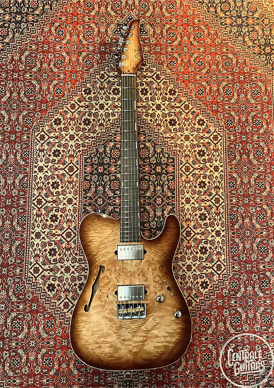 Suhr Custom Shop. Вот великолепный пример изготовления от Custom Shop Suhr. Исходя из модели Suhr Alt T, мы получаем прекрасную деку из Waterfall Burl Maple, корпус из африканского окуме, гриф из зирикоте и звукосниматели ThornBucker. Уникальный экземпляр.