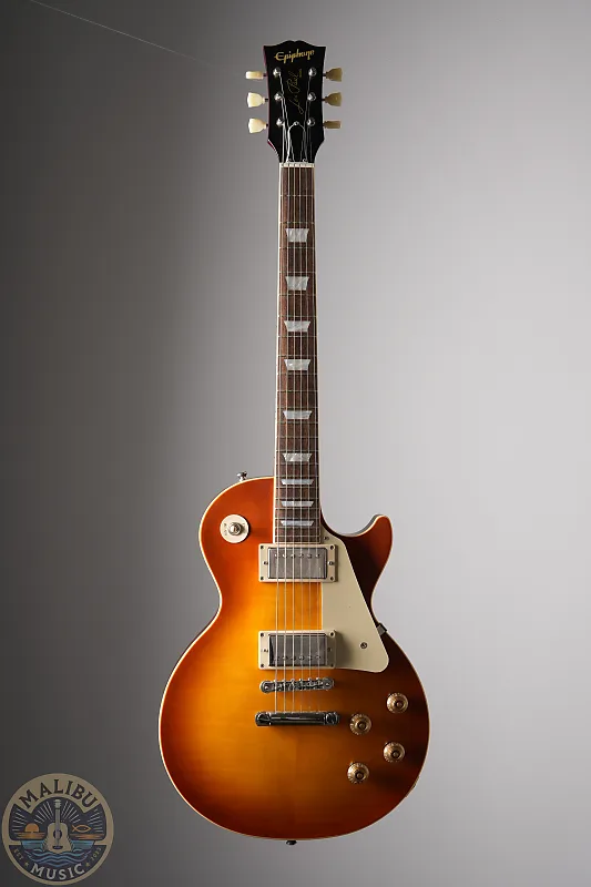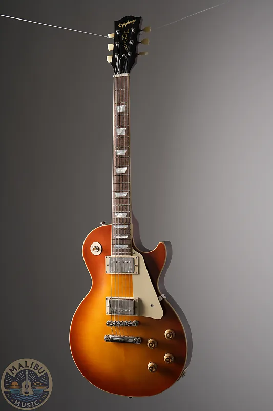 Epiphone 1959 Les Paul Standard, созданная в сотрудничестве с Gibson Custom, является удивительной реконструкцией редкой винтажной классики с обновлениями для повышения аутентичности. Она оснащена корпусом из красного дерева и крышкой из клена с шпоном AAA Flame Maple, имеет цельный гриф из красного дерева с удобным округлым профилем '59 средней C, длинным шипом грифа и головкой в стиле Gibson «открытая книга» R9. Гитара также включает покрытие VOS (Vintage Original Sheen), хамбакеры Gibson Custombucker, переключатель Switchcraft и выходной разъем 1/4'', потенциометры CTS, проводку эпохи 50-х, конденсаторы Mallory, цельный безскосовый накладной щиток, винтажные механики Epiphone Deluxe с кнопками Keystone и футляр в винтажном стиле коричневого и розового цвета.