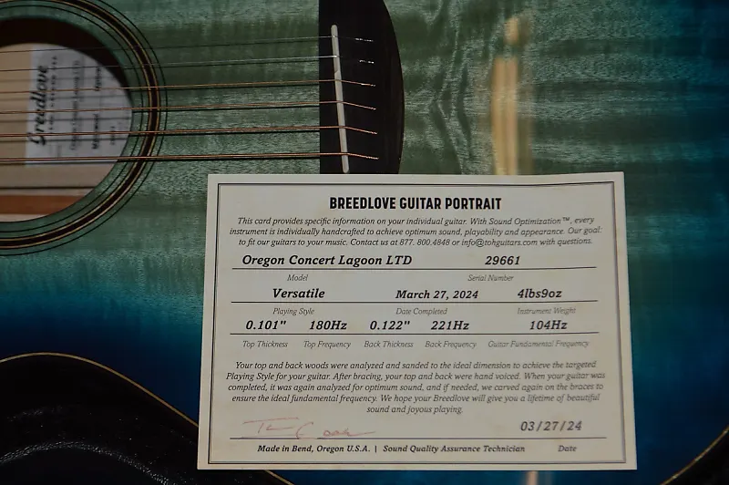Акустическая гитара Oregon Concert Lagoon Limited Edition идеально демонстрирует приверженность Breedlove как к созданию превосходных акустических гитар, так и к охране природных ресурсов. Гитара изготовлена из мякоти миртового дерева, выращенного без вырубки, местного происхождения, что подчеркивает глубину и чистоту ее звучания. Затем каждый инструмент покрывается специальным глянцевым лаком Lagoon Limited Edition. Наконец, в честь Дня Земли 2024 года, Мы сотрудничаем с глобальной некоммерческой организацией по восстановлению лесов One Tree Planted, чтобы посадить 100 новых деревьев за каждую проданную гитару. Эти Made in Bend гитары, красивые и уникальные, с сенсорной отдачей, которую нужно ощутить лично, станут любимыми как для музыкантов, так и для коллекционеров. Производство крайне ограничено. Приобретайте свою, пока они не распроданы. $4,399.00 = РРЦ.............$1,999.00 ваша цена в WOLFE GUITARS.Накладка, задняя стенка и обечайки из миртлаПопуляризованный Breedlove, миртл с ветреного побережья Орегона сочетает в себе лучшие качества розового дерева, махагони и клена - богатый бас, теплый средний диапазон и чистые, яркие верха - для по-настоящему универсальных гитар. Каждый инструмент с уникальным звучанием индивидуализирован за счет смятого, дико разнообразного, но всегда привлекающего внимание рисунка древесины.Форма корпуса ConcertФорма Concert, самая популярная форма корпусов Breedlove - разработанная 30 лет назад и до сих пор пользующаяся спросом - предпочитаема взыскательными музыкантами за ее универсальное, сбалансированное и выразительное звучание. и удобство игры благодаря эргономике. Эта флагманская платформа одинаково хорошо звучит как при игре медиатором, так и при игре пальцами, и идеально подходит для аккомпанемента человеческому голосу.