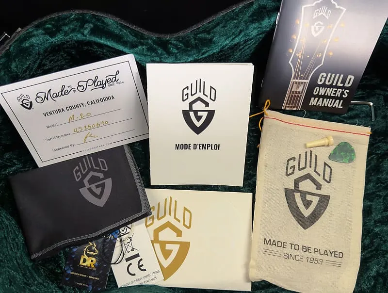 Знаменитая модель Guild M-20 стала первой гитарой, сошедшей с производственной линии в 1967 году, когда компания выросла настолько, что перебралась на новый завод в Вестерли, Род-Айленд. Почти 50 лет спустя история повторилась на совершенно новом, ультрасовременном предприятии в Калифорнии. M-20 - это акустическая гитара концертного размера с цельной крышкой, задней частью и обечайками из махагони, неофициально прозванная «гитарой Ника Дрейка» за появление на обложке альбома Дрейка Bryter Layter. Она оснащена розовой мостовой и грифовой накладкой, костяным порожком и седлом, а также чрезвычайно легким сатиновым покрытием, которое позволяет гитаре по-настоящему звучать. Скромные элементы отделки M-20 включают винтажный розеточный мотив и логотип Guild на грифа, выполненный из перламутра Pearloid. Каждая M-20 поставляется с сертификатом подлинности, подписанным вручную и пронумерованным, а также с жестким футляром. Доступны варианты в цвете Natural и Vintage Sunburst.