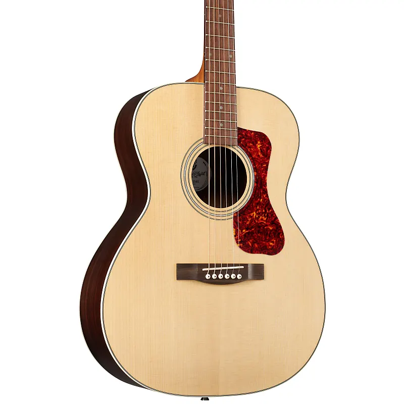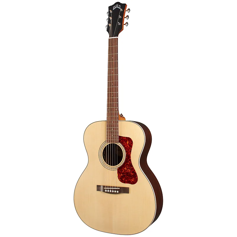 Включает колки Guild Vintage 16 с открытой шестерней и передаточным числом 16:1, истинную костяную кость для нейла и седла, накладку из черепахового панциря, многослойную розетку и обводку из перламутра, а также классическое сочетание резонансного дерева - ель и палисандр.