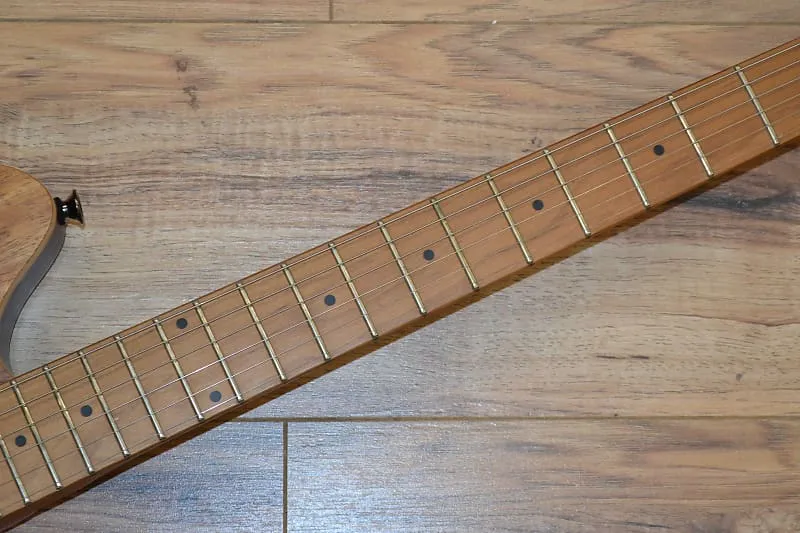 Этот стильный топор, разработанный для комфортной игры и скорости, также имеет смазанную маслом отделку задней части грифа и накладку из обожженного клена с радиусом 12-16 дюймов с закругленными краями, 22 крупными ладами и черными инкрустациями в виде точек.