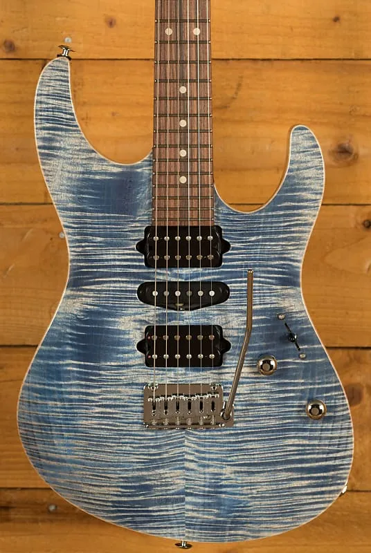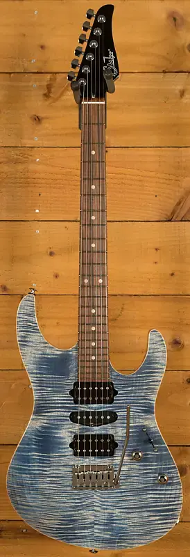 С корпусом из липы и роскошной крышкой из клена Flame Maple, он обладает превосходным тоном, легким весом и прекрасно сбалансирован для игры. Suhr отделали его в цвете Trans Blue Denim/Slate и применили контуры для руки, ладони и живота для действительно комфортной игры.