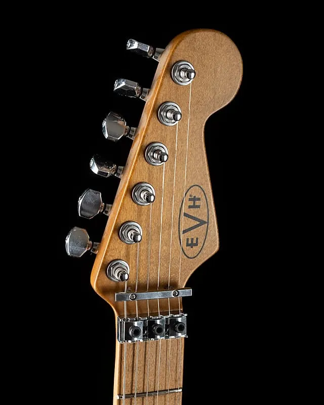 Другие уникальные особенности включают ручку регулировки громкости в стиле Strat с белой юбкой (с надписью «тон»), изготовленную на заказ черную защиту медиатора, хромированную фурнитуру, стандартные кнопки ремешка и шейную пластину EVH.