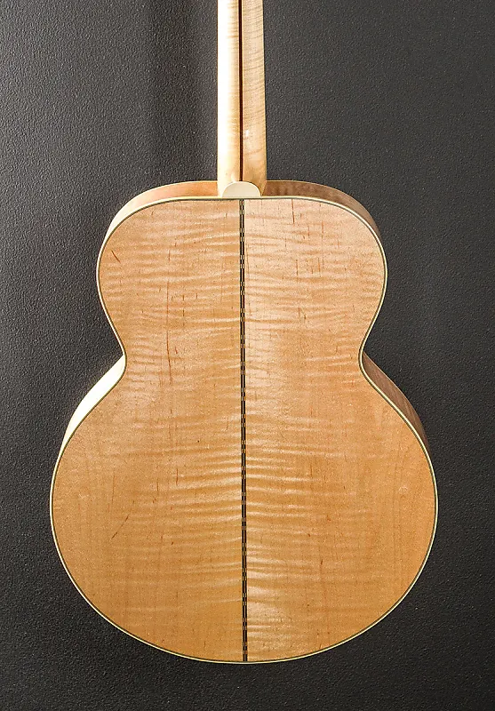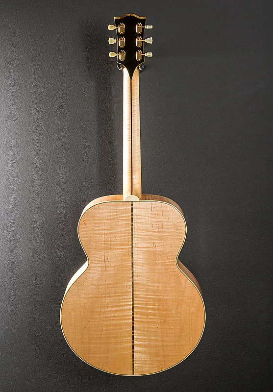 Antique Natural, суперджамбо форма корпуса SJ-200, тонкое покрытие из нитроцеллюлозного лака VOS, термально состаренная дека из еловой древесины Sitka, традиционная ручная выемка X-образного каркаса, корпус и боковые части из кленового флейма, мультислойные окантовки деки и корпуса, округлый двухкомпонентный кленовый гриф, окантованный 12-дюймовый радиус накладки из розового дерева с инкрустацией из перламутровых корон с градуировкой и стандартными ладами, длина мензуры 25,5", ширина верхнего порожка 1,724", колки Gotoh Keystone, с жестким футляром