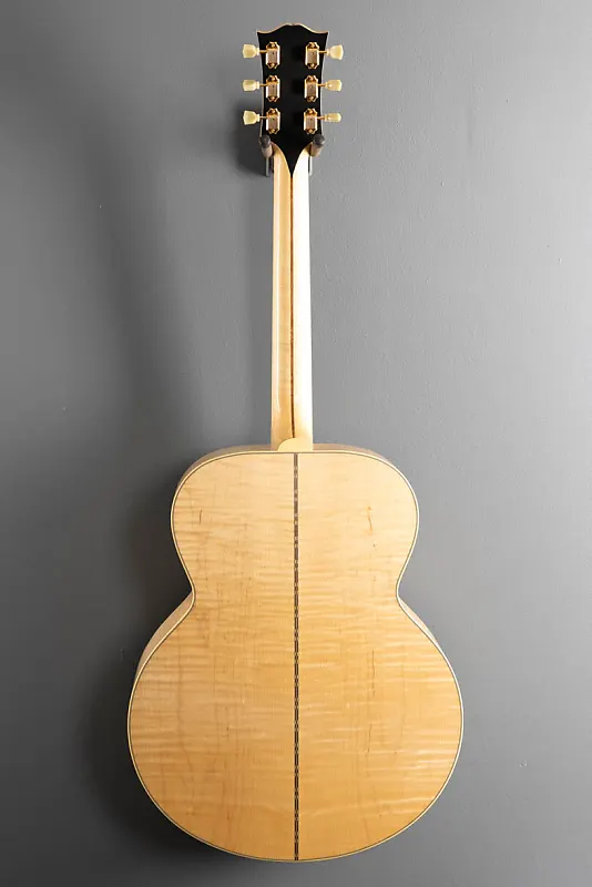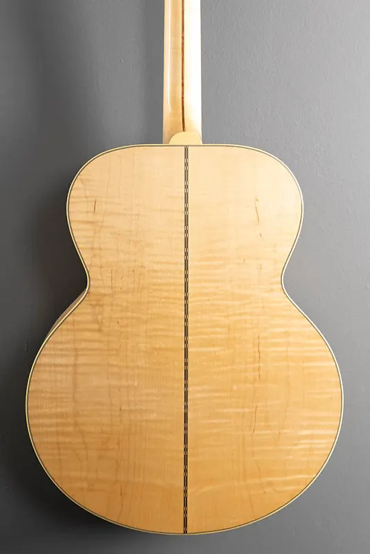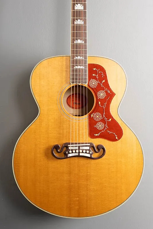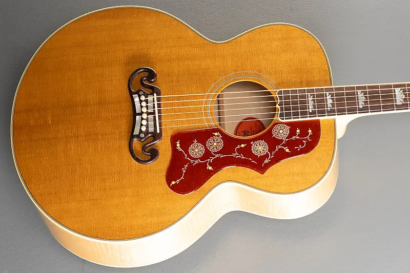 Antique Natural, суперджамбо форма корпуса SJ-200, тонкое покрытие из нитроцеллюлозного лака VOS, термально состаренная дека из еловой древесины Sitka, традиционная ручная выемка X-образного каркаса, корпус и боковые части из кленового флейма, мультислойные окантовки деки и корпуса, округлый двухкомпонентный кленовый гриф, окантованный 12-дюймовый радиус накладки из розового дерева с инкрустацией из перламутровых корон с градуировкой и стандартными ладами, длина мензуры 25,5", ширина верхнего порожка 1,724", колки Gotoh Keystone, с жестким футляром
