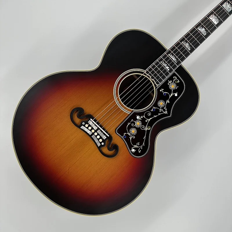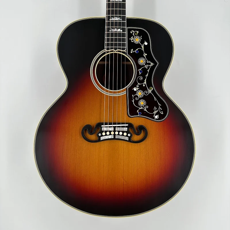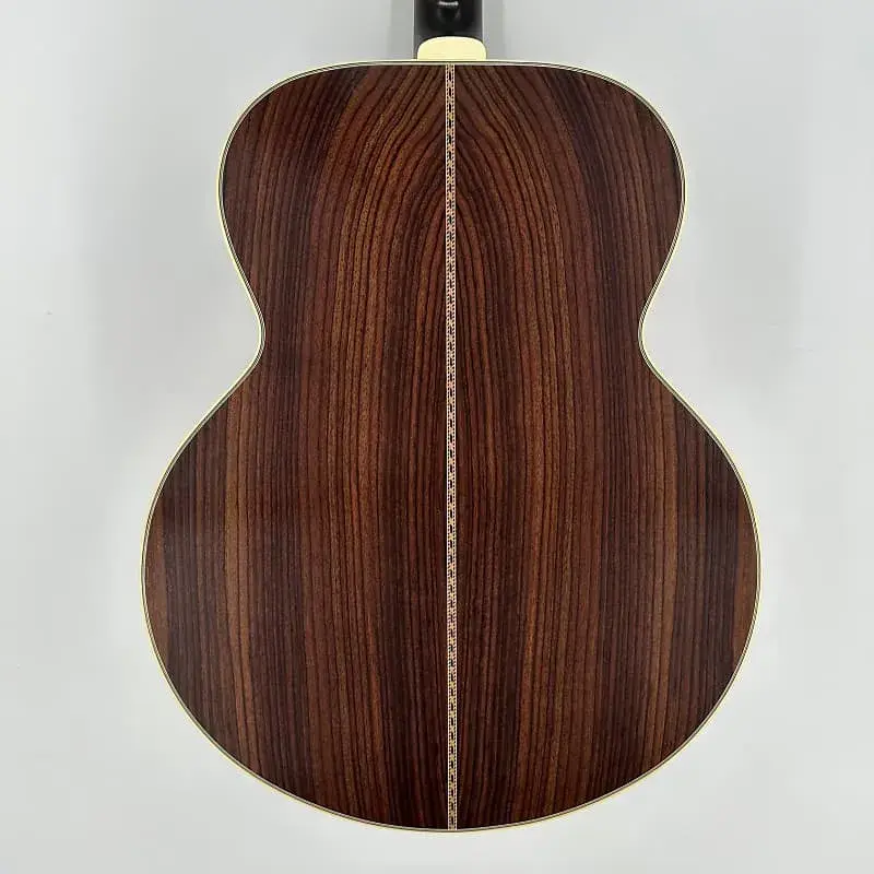 Верх из термически состаренной красной ели, задняя часть и обечайки из палисандра, грифовая накладка из палисандра, верхнее крепление брусков из горячего клея для лучшего тонального отклика, кость на порожке, седле и штифтах моста.