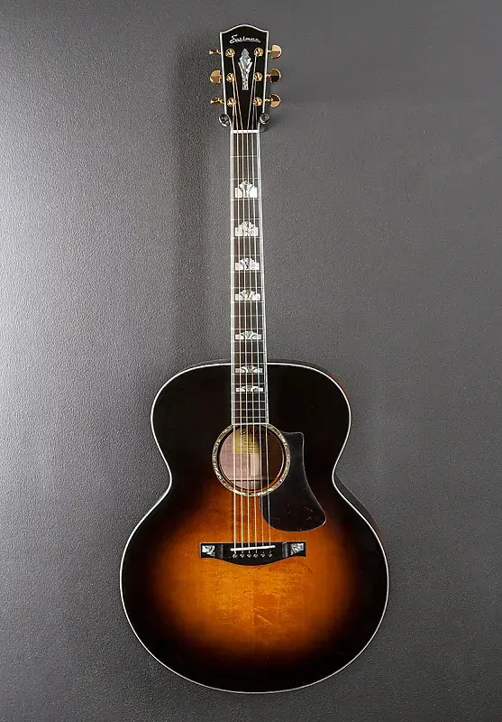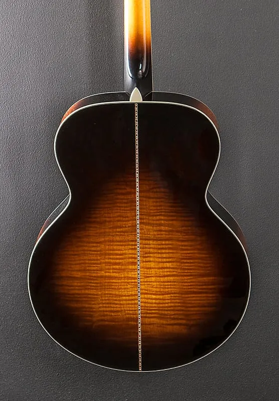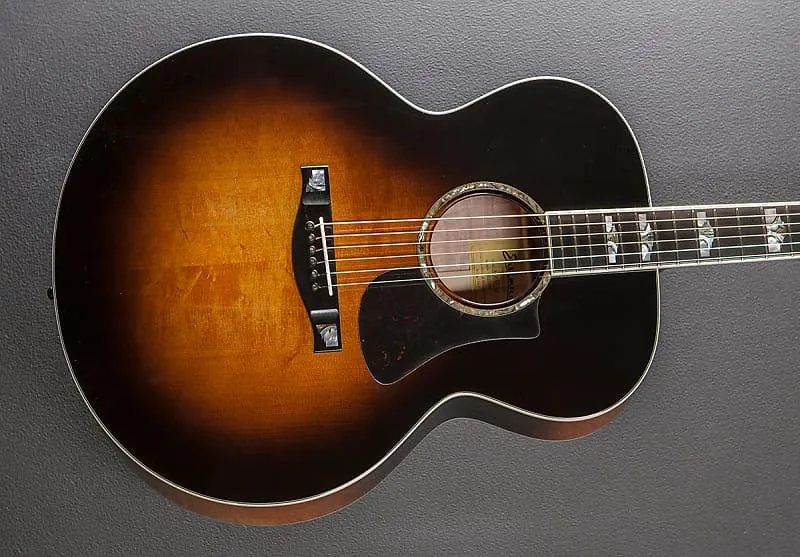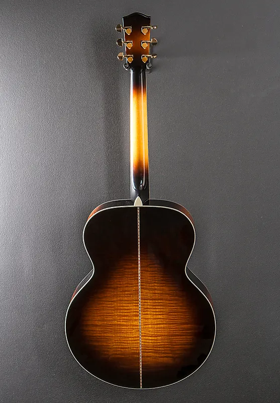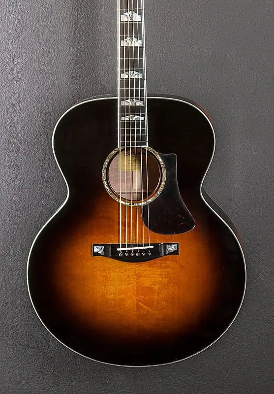 Солнечный взрыв, глянцевая отделка, корпус формы Jumbo, верх из массива ели Энгельмана, ручная резьба с рифленым X-образным каркасом, розетка из гелиотиса (абалона), спинка и обечайки из массива кленового дерева с рисунком пламени, окантовка из черного/иворио, 12-дюймовая радиусная накладка из эбенового дерева с инкрустацией из перламутра и абалоны на традиционной ровной C-образной шее из клена, колки Gotoh, мензура 25,4 дюйма, ширина прорези грифа 1 3/4 дюйма, с жестким чехлом