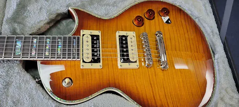Гитары серии LTD EC-1000 разработаны, чтобы предложить звук, ощущения, внешний вид и качество, необходимые профессиональным музыкантам, а также цены, которые типичные музыканты могут себе позволить. EC-1000FM обладает всеми изысканными функциями LTD Deluxe, которые выделяют ее среди других гитар в этом диапазоне, такими как инкрустации и окантовка из гелиотиса, полное окантование корпуса/грифа/головки, а также первоклассные компоненты, такие как колки LTD с фиксацией, мост и хвостовая часть Tonepros с фиксацией, и классические пассивные звукосниматели Seymour Duncan JB/’59. Также гитара предлагает конструкцию set-thru с корпусом из махагони, верхней дека из клена с фигурной текстурой, 3-частным грифом из махагони и накладкой грифа из эбена макассар с 24 ладами. Доступна в цвете Amber Sunburst