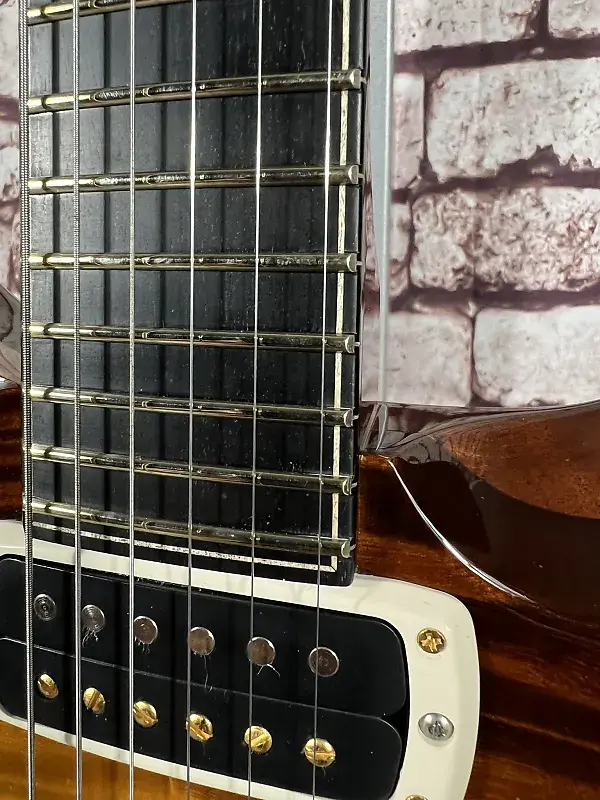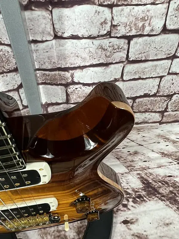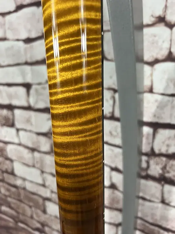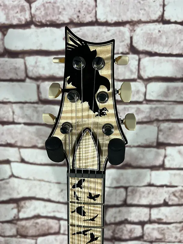 Особенности: Высокоглянцевое нитро-лаковое покрытие, верх из кудрявого клена, задняя часть из африканского красного дерева, шея из кудрявого клена, окрашенная в тон, накладка на гриф и облицовка головки грифа из кудрявого клена и эбена, "Birds of a Feather", фурнитура золото/никель, оснащена звукоснимателями TCI