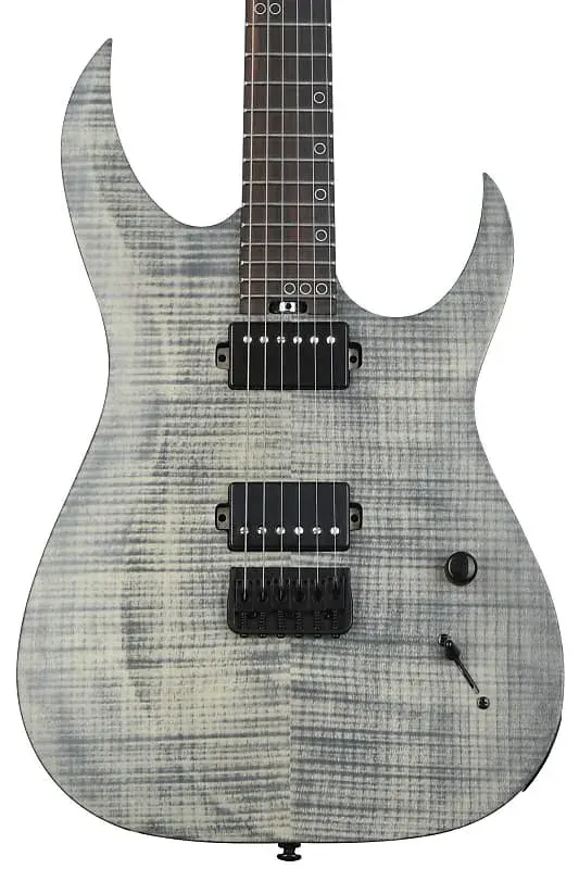 Электрогитара с массивным корпусом из нятова, многошаровой гриф из клена и розового дерева, накладка на гриф из эбена и 2 хамбакерных звукоснимателя - серого цвета.