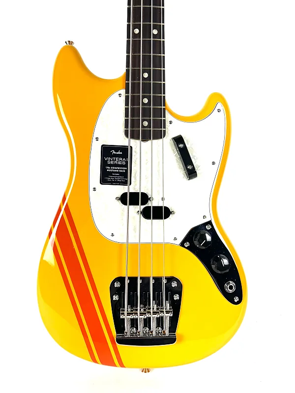 Это потрясающая и доступная воссозданная версия культовых бас-гитар Mustang с гоночными полосами 70-х годов. Короткий гриф и очень крутой цвет Competition Orange.
