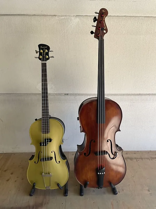 E-Bace - это грифовый полуакустический бас (бас-виолончель) с короткой мензурой, корпусом 1/4 размера виолончели, датчиком Big Magnet P-type и струнами с плоской намоткой. Он излучает древесный старомодный звук. Отлично подходит для фанк-грувов, соула 70-х, бита 60-х или любых новых мелодий, которые ваша творческая фантазия вдохновит сыграть на этом веселом инструменте. Внешне он немного похож на бас «Битлз», но на самом деле это полноценный корпус виолончели, и звучит он больше как акустический P-бас!