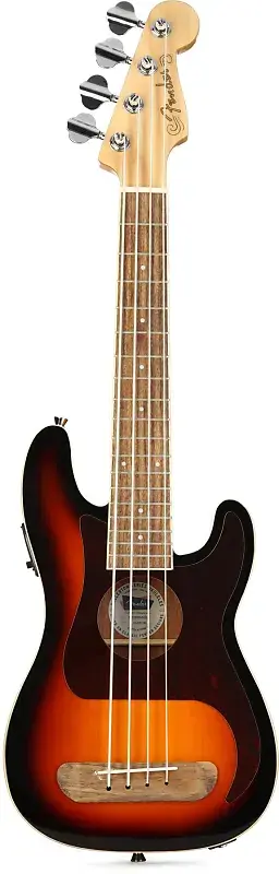 Концертное укулеле с корпусом Precision Bass, верхняя дека из ели, корпус из окуюме, гриф из клена, накладка на гриф из ореха и электроника Fender - трехцветный сунберст.