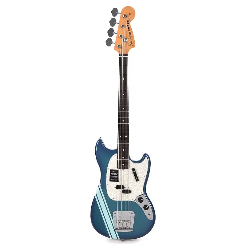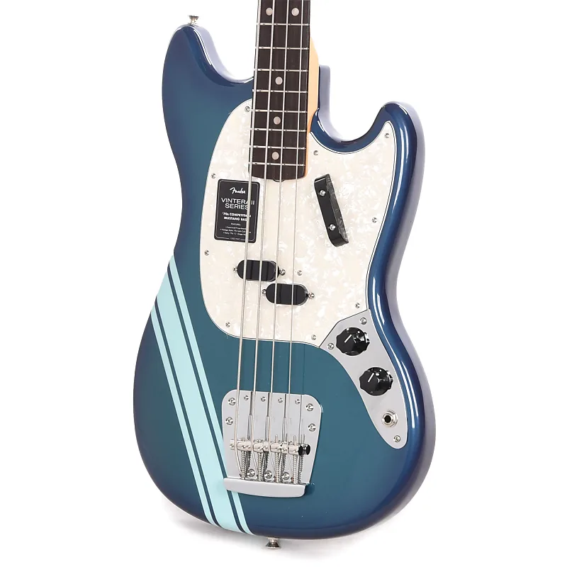 Бас-гитара Vintera II '70s Competition Mustang оснащена грифом из палисандра, мензурой 30 дюймов, спортивной отделкой с гоночными полосами и классической конфигурацией звукоснимателей Mustang Bass.