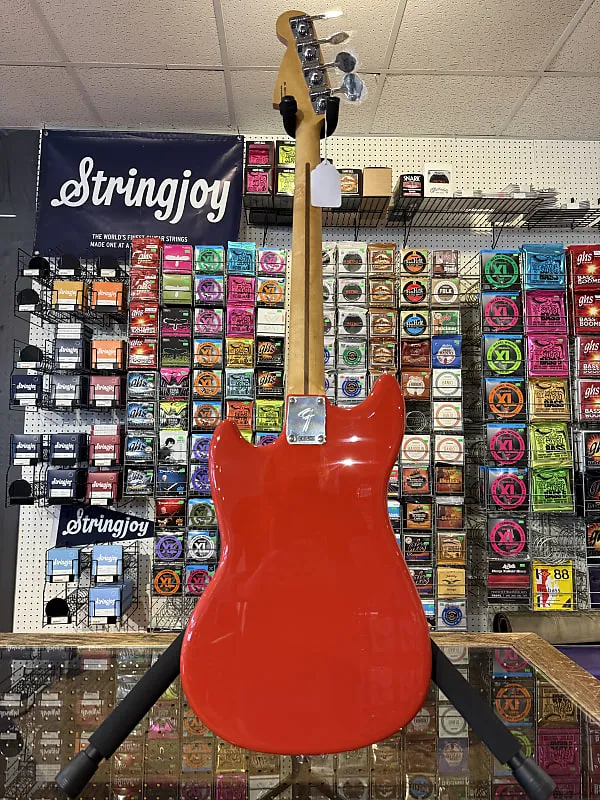 Совершенно новый пример бас-гитары Fender Player II Series Mustang PJ в цвете кораллово-красный.