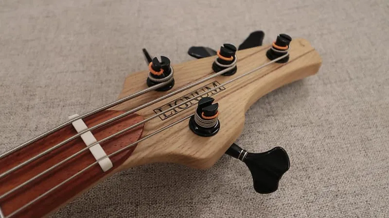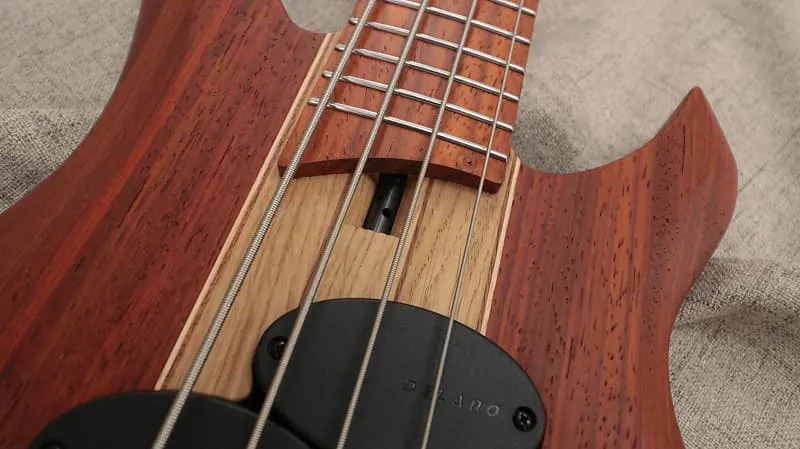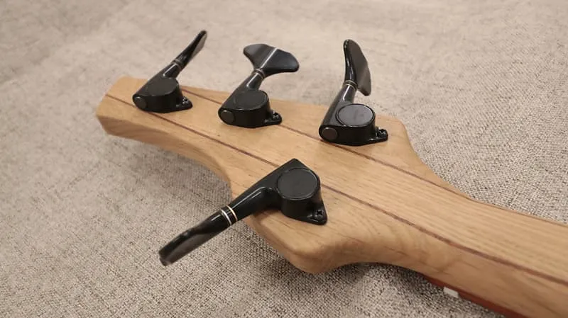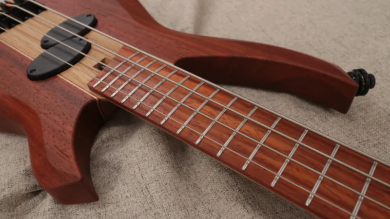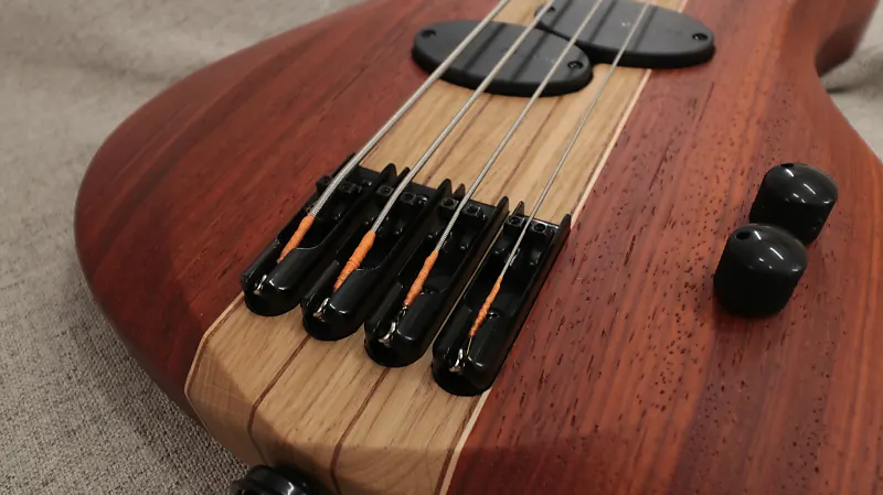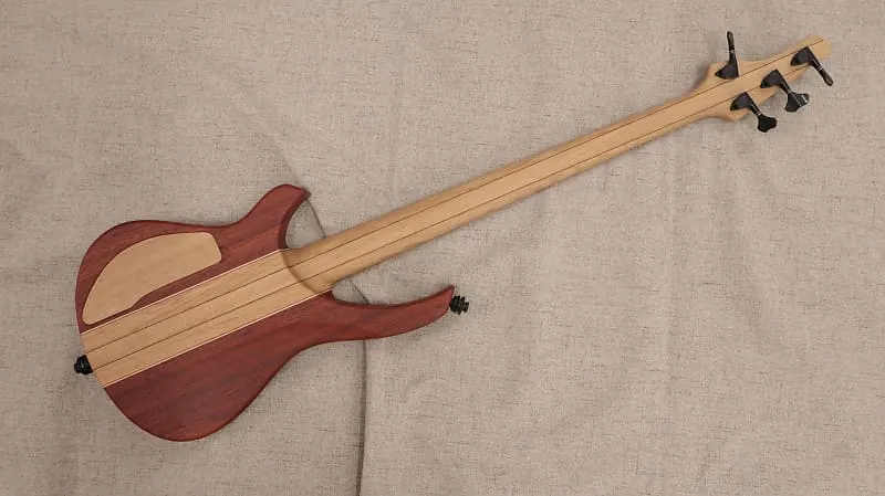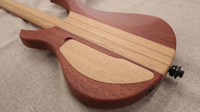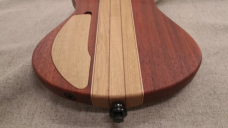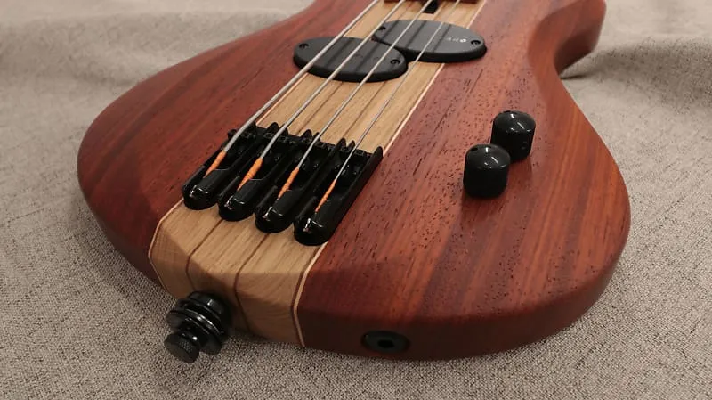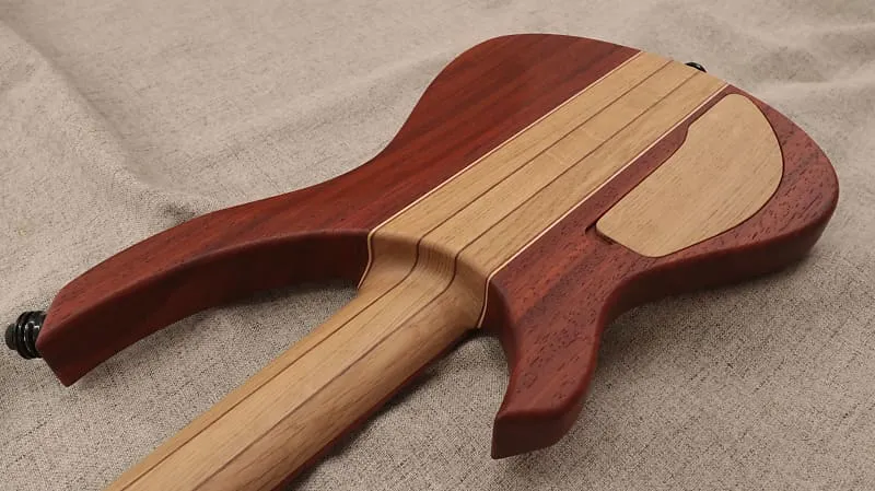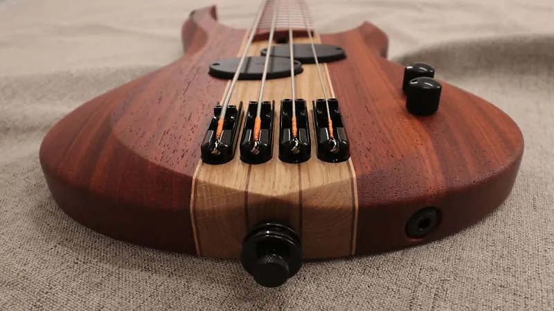 Пружинная бас-гитара с корпусом из падаука и дубовым грифом. 4 полосы красного дерева и ясеня идут от головы к низу корпуса, гриф изготовлен из дерева падаук только с боковыми точками и прозрачной передней частью.