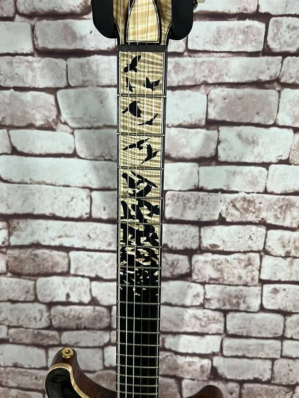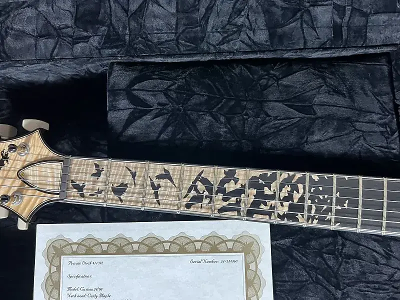 Комплектация: PRS Signature .010Тип футляра: Private Stock Black PaisleyОсобенности: Высокоглянцевое покрытие Nitro, верх из кудрявого клена, задняя дека из африканского махагони, шея из кудрявого клена окрашена в тон верха, накладка на гриф и накладка на головку грифа из кудрявого клена/эбена, 'Birds of a Feather', фурнитура золото/никель, оснащена звукоснимателями TCIСерийный номер: PS #