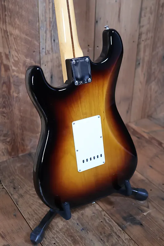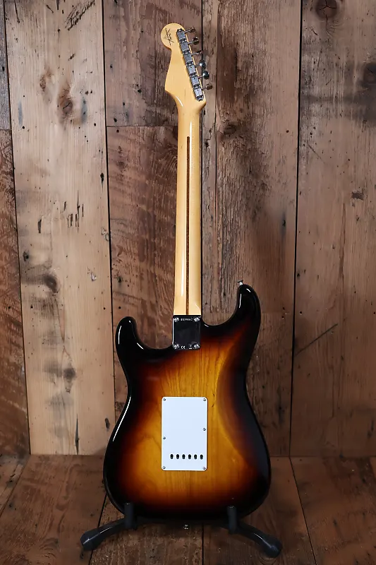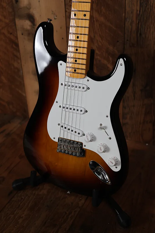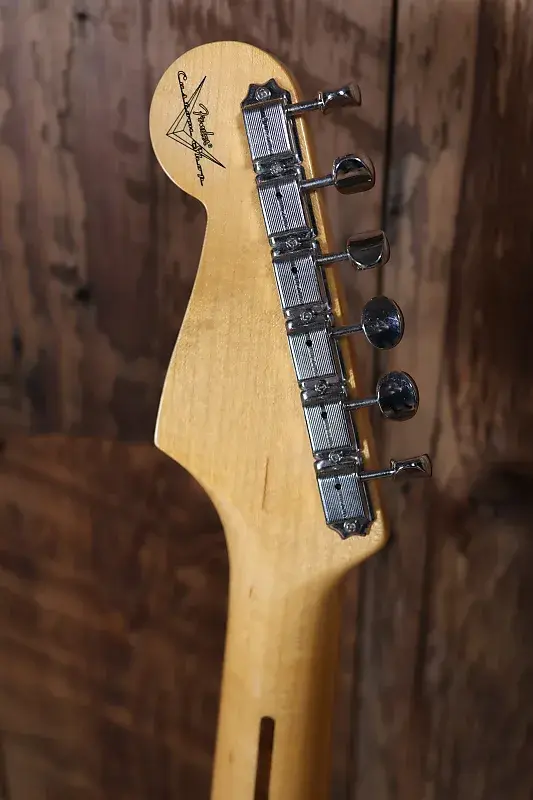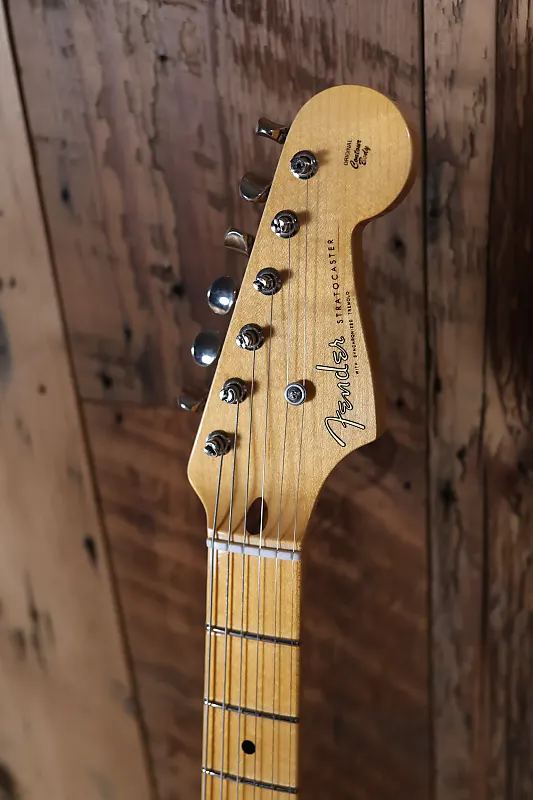 Другие особенности этой гитары включают оборудование Closet Classic, корпус из двух частей из ясеня, накладку грифа из кленовой древесины с тонированной текстурой, профиль грифа '54 "U", 21 средний винтажный лад, вручную намотанные звукосниматели '55 Strat с переходными крышками '54, 5-позиционный переключатель, винтажную проводку, синхронизированный тремоло-мост American Vintage, кость в порожке, круглый струнодержатель и тюнинговые механизмы в винтажном стиле.