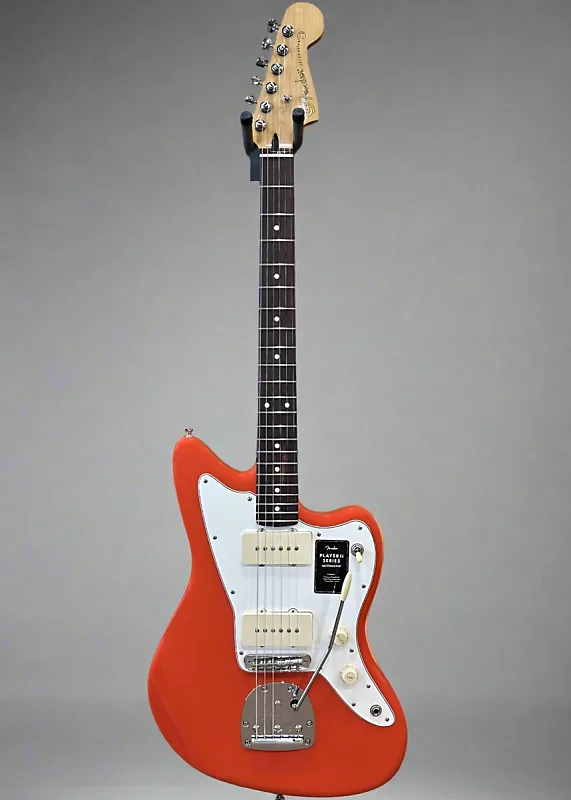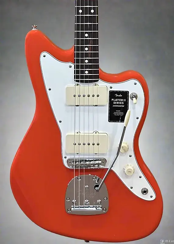 Кораллово-красный, Сделано в Мексике, Глянцевый полиэстеровый корпус, Ольховый корпус, Современный C-образный кленовый гриф с пластиной радиуса 9,5 дюйма из палисандра и средними джамбо-ладами, длина мензуры 25,5 дюйма, ширина порожка 1,650 дюйма, одинарный бридж и нековые звукосниматели серии Player Alnico 5 Jazzmaster, 3-позиционное переключение с регуляторами общей громкости и тембра, Бридж Jazzmaster с седлами Mustang, парящее тремоло в винтажном стиле и тюнеры Fender ClassicGear, 8,4 фунта, чехол в комплект не входит