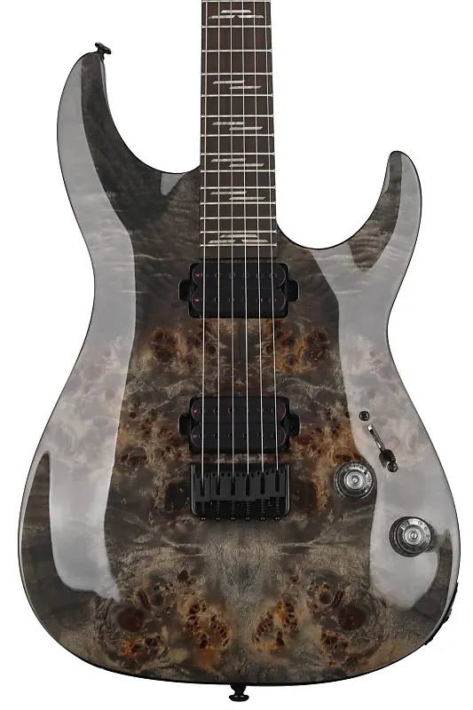 Электрогитара с цельным корпусом, верхняя дека из тополя, корпус из красного дерева, гриф из клена, накладка на гриф из палисандра и 2 хамбакерных звукоснимателя - цвет угольный.