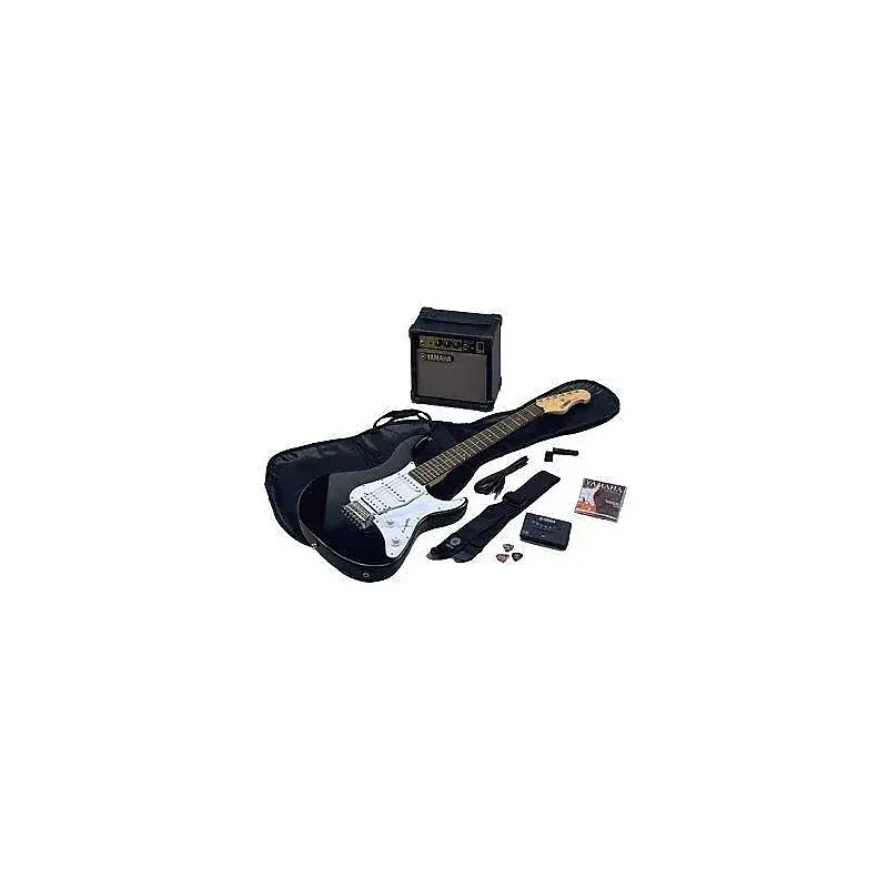 Набор для начинающих, включающий электрогитару, усилитель, тюнер, кабель, медиаторы и чехол.