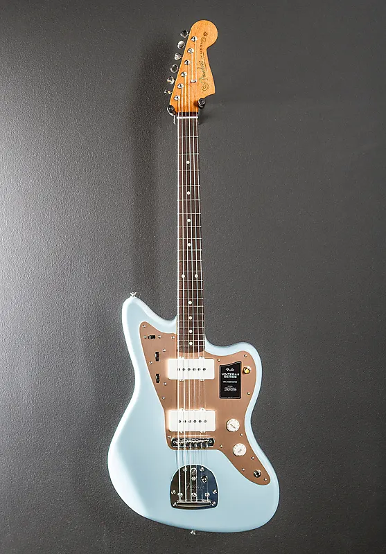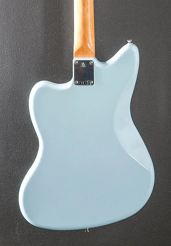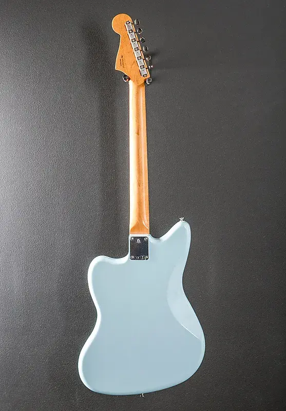 Sonic Blue, сделано в Мексике, корпус из ольхи с глянцевой полиэфирной отделкой, гриф из клена C-образной формы конца 50-х с радиусом 7,25” и накладкой из розового дерева с высоким винтажным ладом, длина мензуры 25,5", ширина порожка 1,650", стильные винтажные сингл-котловые звукосниматели Jazzmaster для бриджа и грифа, 3-позиционный тумблер с управлением громкостью и тоном, а также управляющие элементы для ведущего канала (переключатель вниз): общая громкость, общий тон; элементы управления ритм-каналом (переключатель вверх): два колесика для регулировки громкости и тона звукоснимателя грифа, винтажный регулируемый мост и плавающий тремоло с кнопкой блокировки, винтажные колки, вес 8,6 фунтов, в комплекте с чехлом для гитары