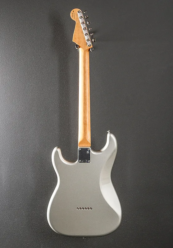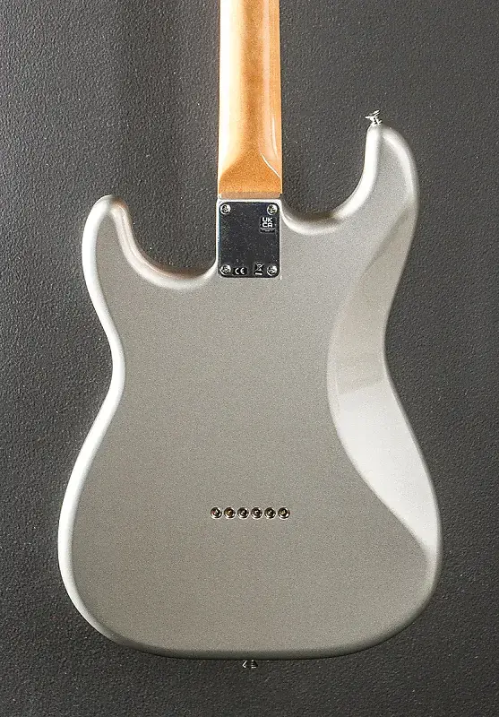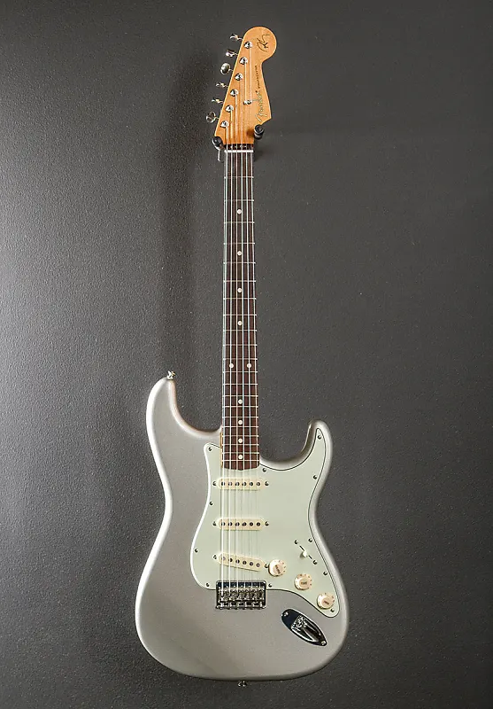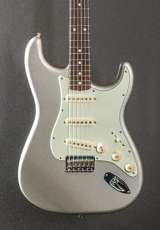 •Inca Silver, Сделано в Мексике, корпус из ольхи, глянцевый полиэстеровый корпус, С-образный кленовый гриф 60-х годов с палисандровым грифом радиусом 9,5 дюйма и средними джамбо-ладами, длина мензуры 25,5 дюйма, ширина порожка 1,650 дюйма, звукосниматели Fender Custom Shop в винтажном стиле с одной катушкой Strat, 5-позиционное переключение с общей громкостью, тон 1. (нековый звукосниматель) и тембр 2. (средний звукосниматель) органы управления, американский винтажный струнный через корпус хардтейл бридж Strat с изогнутыми стальными седлами, тюнеры в винтажном стиле, 7,8 фунта, с чехлом