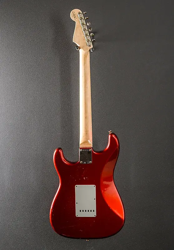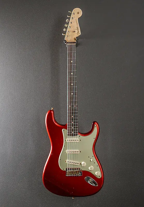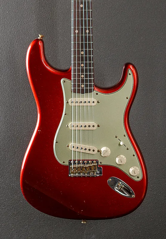 Кэнди Эппл Ред, отделка старого нитроцеллюлозного лака, корпус из ольхи, гриф из клена 60-х с овальным профилем C, радиус накладки из палисандра 9,5 дюймов и средние джамбо лады, длина мензуры 25,5 дюймов, ширина верхнего порожка 1 5/8 дюйма, ручная намотка звукоснимателей 60-х Strat Relic, 5-позиционный переключатель с регуляторами громкости/тона/тона, американское винтажное тремоло с изогнутыми стальными седлами, тюнеры в стиле Fender Vintage, толщина грифа 0,80″ на первом ладу и 0,95″ на 12-м ладу, вес 7,8 фунта, в жестком футляре