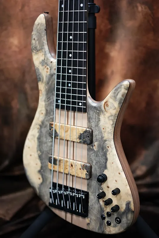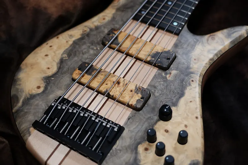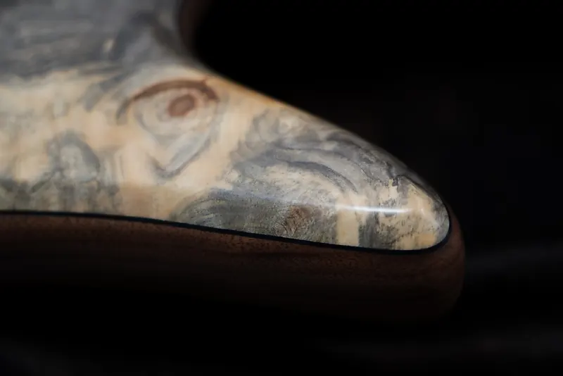 Деревянная крышка звукоснимателя выполнена из ореха с боковинами из спины Eye Burl, так же как и корпус, что также привлекает внимание.