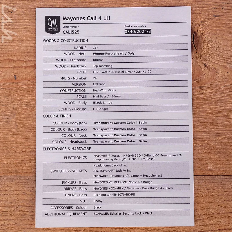 Цель и намерение Mayones - экономить как можно больше древесины в производственном процессе. Cali изготовлен из остатков качественной древесины, используемой для полноразмерных инструментов, которые слишком малы для обычного инструмента. Инструмент выпускается ограниченной серией.
