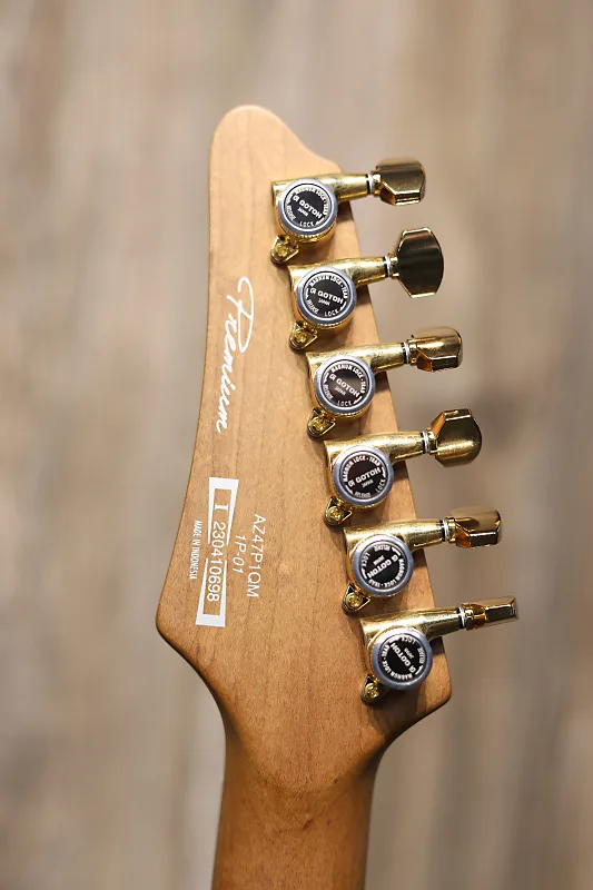 Электрогитара Ibanez Premium AZ47P1QM. Отличается контурированным корпусом из американского басса, верхней декой из кленового шпона, грифом из обожженного клена с профилем Ibanez AZ овальный «C», накладкой из черного эбенового дерева, 24 стальными ладами, звукоснимателями DiMarzio в конфигурации HSH, тремоло Gotoh T1502 и блокирующими колками MT-G. По-настоящему профессиональный инструмент.