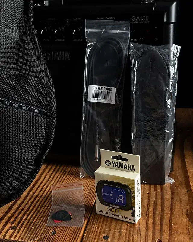 В комплект входит гитара PAC012, усилитель Yamaha 15 Вт, чехол для гитары, хроматический тюнер, кабель для гитары, обучающее DVD, ремень, запасные струны, медиаторы и рычаг тремоло.