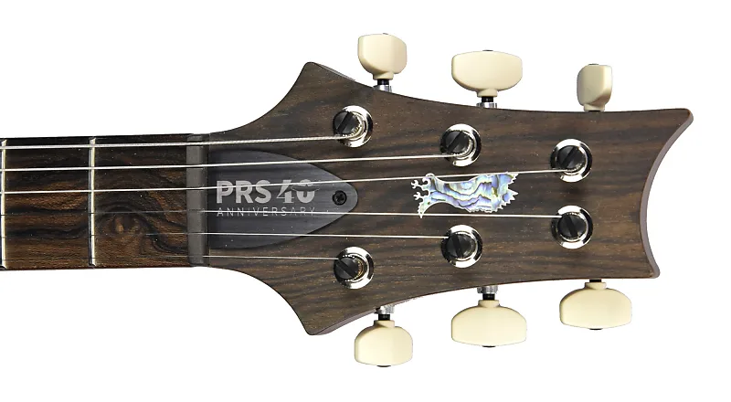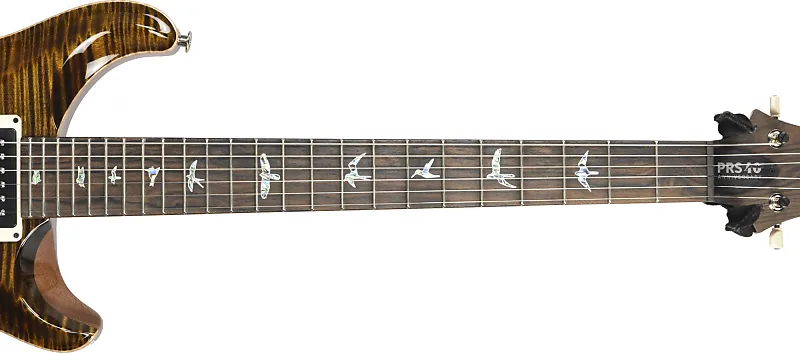 Основанная на проверенной конструкции с корпусом и грифом из красного дерева и верхней дека из клена артистического класса, модель 40th Anniversary Custom 24 обладает ретро-вырезом верхней декой в стиле скрипки, фигурными накладками в виде птиц PRS “Old School” с контурами и головой орла PRS «Pre-Factory» на головке грифа, что отдает дань уважения ранним гитарам PRS. Помимо этих эстетических особенностей, 40th Anniversary Custom 24 смотрит в будущее с полностью новыми звукоснимателями PRS DMO Treble и Bass. Звукосниматели DMO (DMO обозначает Dynamic, Musical, Open - Динамичный, Музыкальный, Открытый) были разработаны Полом Ридом Смитом и командой инженеров PRS New Products Engineering для достижения широкого, открытого звучания с вокальным характером.