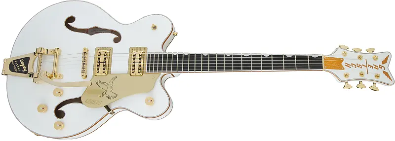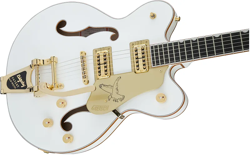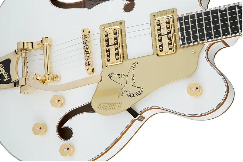 - Фурнитура: золотое покрытие, колки Gotoh с блокировкой, декоративные ручки управления G-Arrow с драгоценными вставками, золотой комплекта защитной накладки с логотипом Gretsch