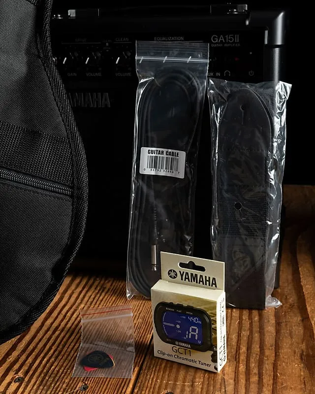 В комплект входит гитара PAC012, усилитель Yamaha 15 Вт, чехол для гитары, хроматический тюнер, кабель для гитары, обучающее DVD, ремень, запасные струны, медиаторы и рычаг тремоло.