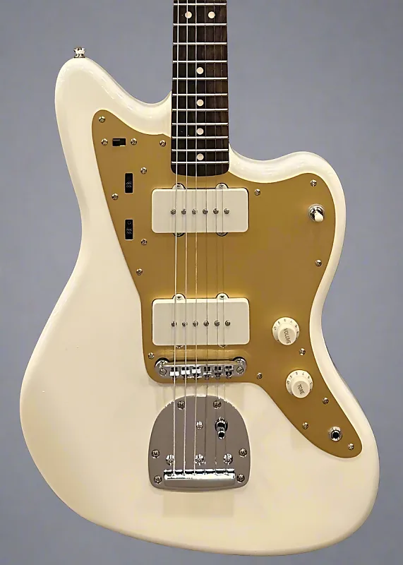 ‧Винтажный белый, изготовлен в Китае, корпус из липы, глянцевая уретановая отделка корпуса, гриф C-образной формы с грифом Indian Laurel радиусом 9,5 дюйма и джамбо-ладами, длина мензуры 25,5 дюйма, ширина порожка 1,675 дюйма, бридж и нековые звукосниматели Alnico с одной катушкой от Fender, 3-позиционное переключение с регуляторами громкости и тембра, а также управление ведущей цепью (ползунковый переключатель вниз): общая громкость, общий тон; элементы управления ритмической схемой (ползунок вверх): два колесика управления громкостью и тембром нека, бридж Adjusto-matic с плавающим тремоло в винтажном стиле, винтажный стиль тюнеры, 8,0 фунтов, чехол не входит в комплект