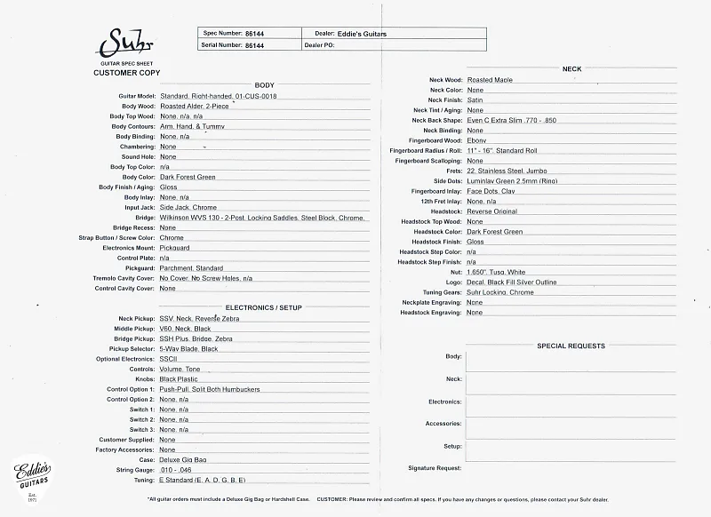Полностью укомплектован премиальным чехлом (Deluxe Gig Bag), Suhr Standard Roasted - Dark Forest Green является инструментом профессионального уровня для музыкантов, которые хотят сочетание тембра, скорости и стиля в одном замечательном и мастерски созданном инструменте.