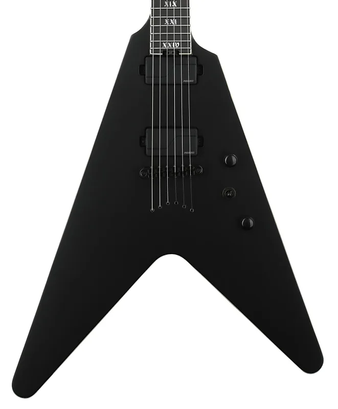 Электрогитара с цельным корпусом из древесины болотного ясеня, гриф из клена/ореха/падаука, накладка на гриф из эбена и 2 активных хамбэкинг-пикапа - сатиново-черная.