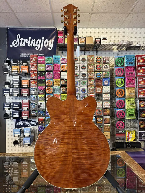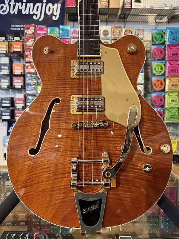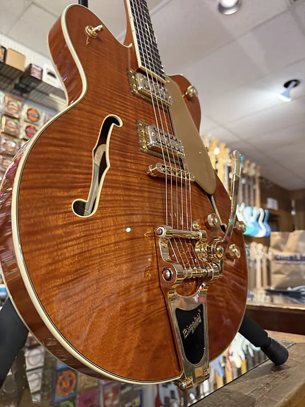 Совершенно новый пример модели Gretsch Electromatic LTD Flame Okourne Broadkaster Double Cut с тремоло Bigsby в потрясающем оранжевом цвете.