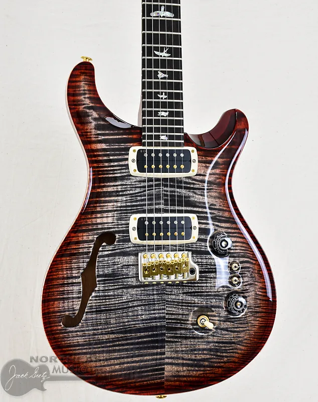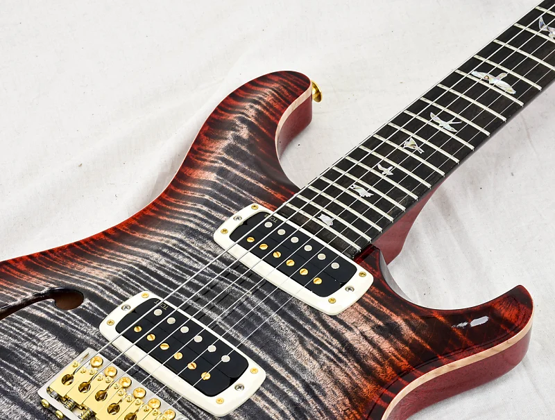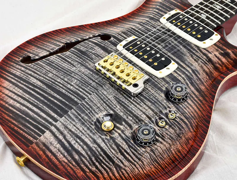 Модель 40th Anniversary Custom 24-08 Semi-Hollow Limited Edition начинается с крышки из фигурного клена «10-top», задней части и грифа из махагони и накладки грифа из зирикота. Это сочетание древесины, вместе с нашими тщательными процессами сушки, создает устойчивую и резонирующую основу. Добавление полузакрытого корпуса придает еще более полный и органичный тон, а F-образное отверстие добавляет элегантный визуальный акцент.