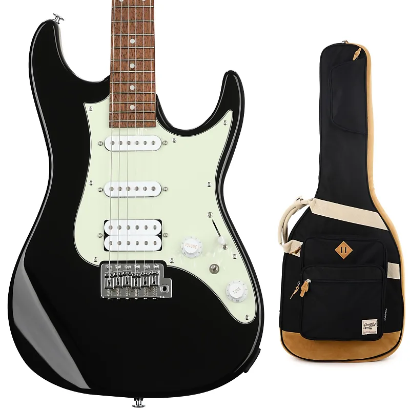 Электрогитара с цельным корпусом из тополя, гриф из клена, накладка грифа из жатобы, 2 сингловых звукоснимателя, 1 хамбакер и тремоло - черная с чехлом.