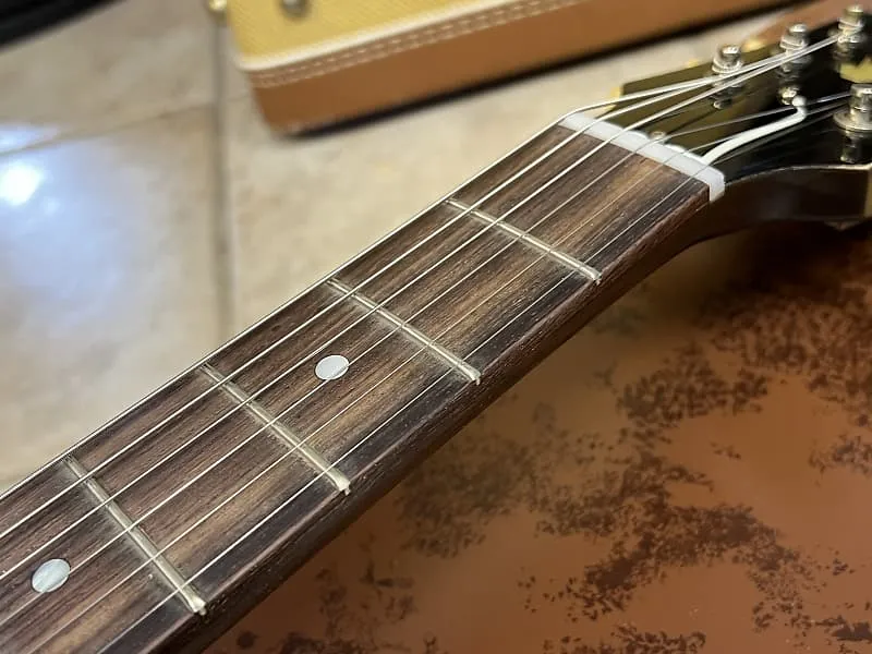 Шейка '58 с закругленными краями без окантовки имеет гладкое, стройное ощущение для быстрой игры. Его винтажная ширина косточки .687 и округлый профиль C ощущаются элегантно и привлекательно. Гриф из индийского палисандра имеет закругленные края для комфорта. Узкие винтажные лады способствуют легкому бендингу. Убранная окантовка грифа максимально увеличивает контакт между вашей рукой и грифом для плавной и динамичной игры. Гриф без окантовки превосходит ожидания.