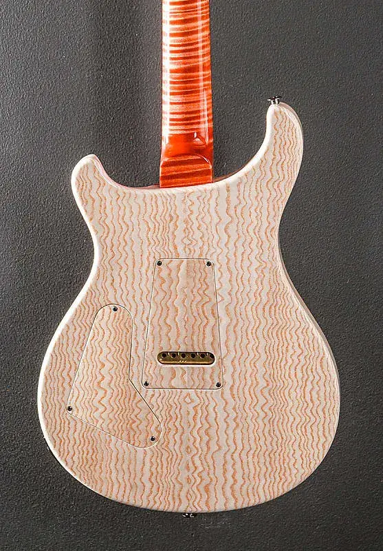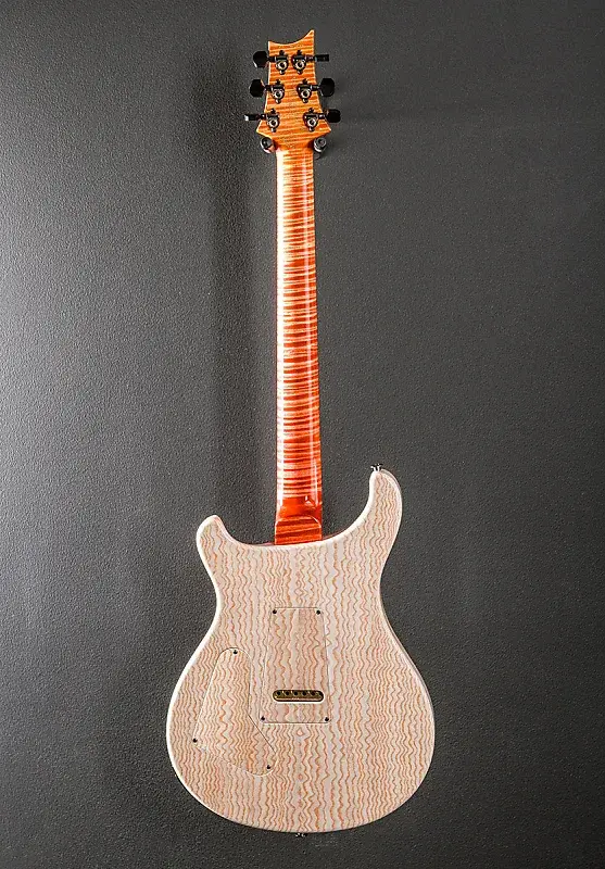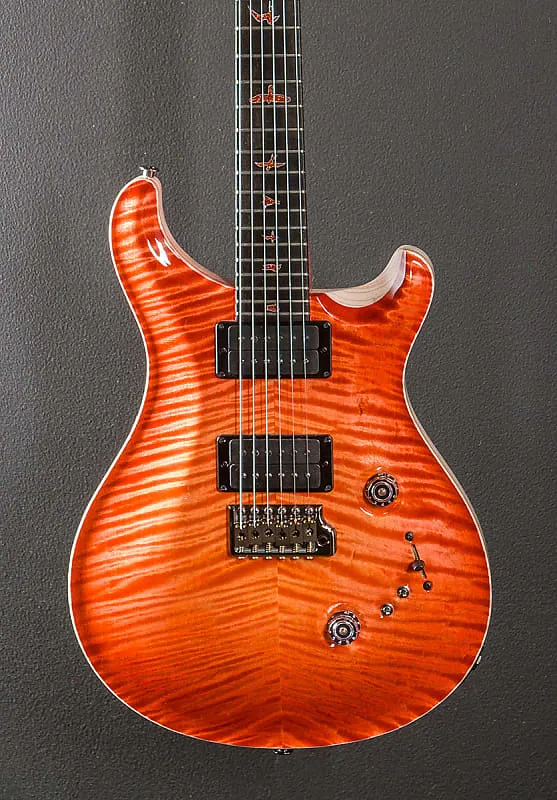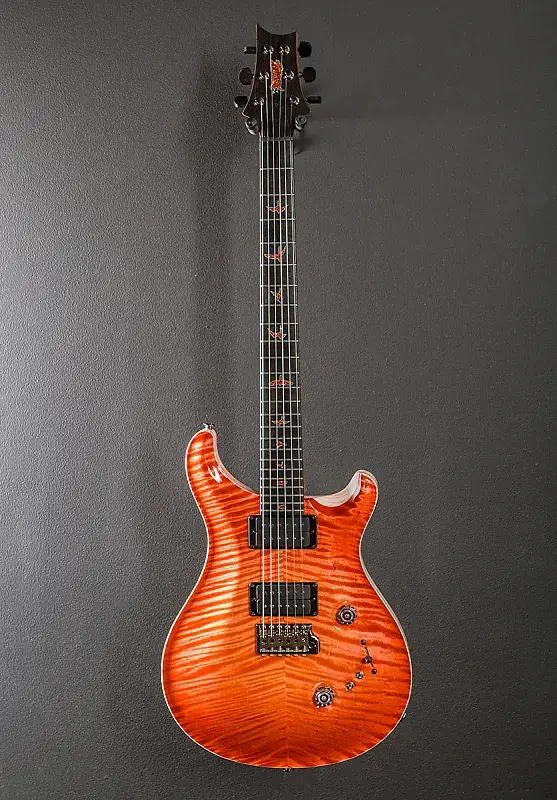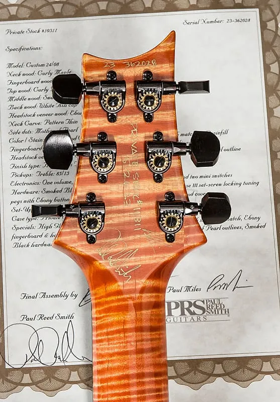 Blood Orange Glow с белой отмывкой, номер Private Stock 10311, высокоглянцевое нитро покрытие, двухчастная верхняя декa из кудрявого клена, сердцевина корпуса из болотного ясеня с задней крышкой из белого ясеня, гриф Pattern Thin из кудрявого клена, грифовая накладка из эбенового дерева с радиусом 10" и инкрустацией из перламутра Sparkle Resin в форме птиц, накладка на головке грифа из эбена с инкрустацией Private Stock Eagle из перламутра Sparkle Resin, длина мензуры 25", ширина верхнего порожка 1 11/16", звукосниматели PRS 85/15 для бриджа и грифа, 3-позиционный переключатель с регуляторами громкости и тембра, а также двумя мини-переключателями coil tap, тремоло PRS Smoked Black Gen III, колки-блокировщики PRS Smoked Black Phase III с эбеновыми кнопками, вес 7.6 фунтов, в жестком футляре Private Stock Black Paisley.