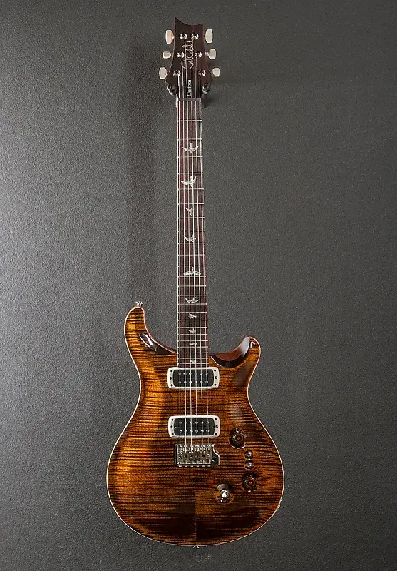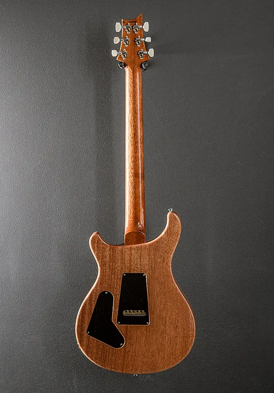 Yellow Tiger, высокоглянцевое нитро-покрытие, верх из фигурного клена, вырезанного по форме скрипки, корпус из красного дерева, тонкая вырезанная шейка из красного дерева, гриф из розового дерева с инкрустацией в виде птиц радиусом 10 дюймов, мензура 25 дюймов, ширина верхнего порожка 1 11/16 дюйма, мост и звукосниматели PRS TCI, 3-позиционный переключатель с контролем громкости и тона плюс два мини-переключателя для катушечного тапинга, PRS Gen III тремоло, PRS Phase III блокирующие колки с крылатыми кнопками, вес 7,8 фунтов, с жестким кейсом