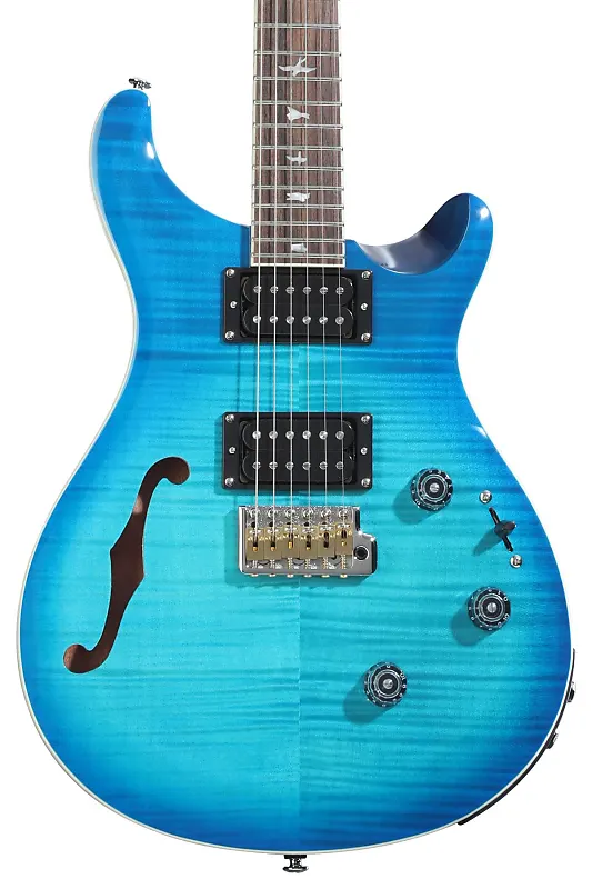 Полуакустическая электрогитара с корпусом из красного дерева, верхней декой из клена, грифом из клена, накладкой на гриф из палисандра, двумя хамбакерами и тремоло PRS - цвет Lake Blue.