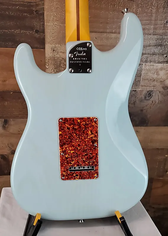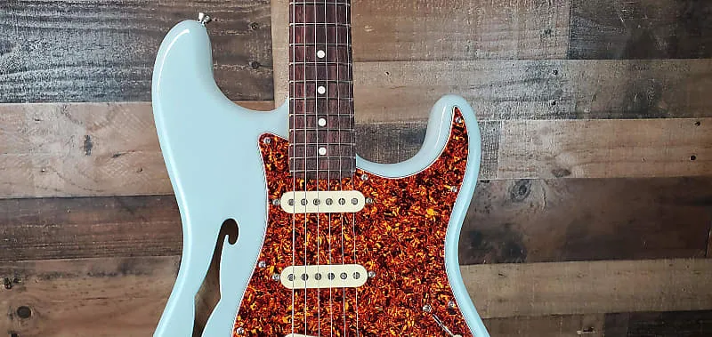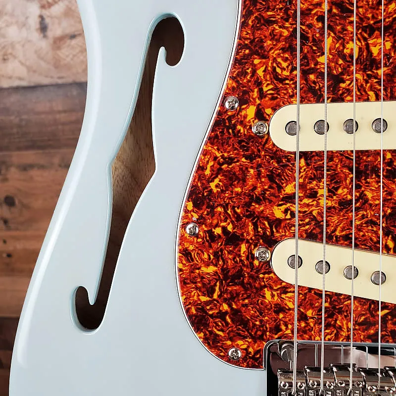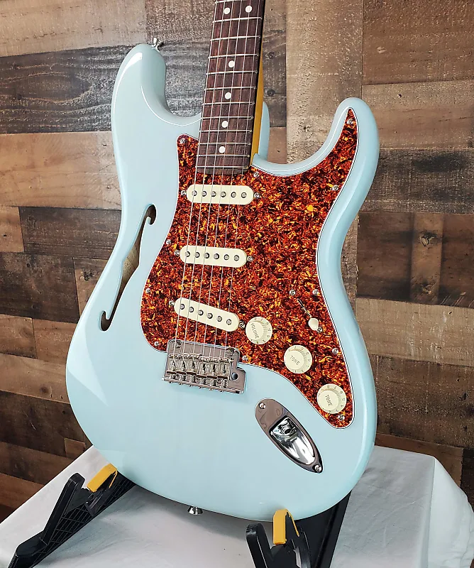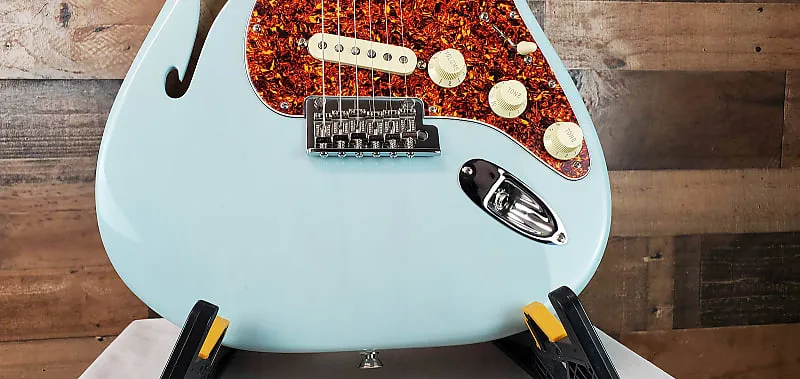 полуполая электрогитара Daphne Blue с корпусом из ясеня, кленовым грифом, палисандровым грифом, 3 однокатушечными звукоснимателями и 2-точечным тремоло - прозрачным Daphne Blue.