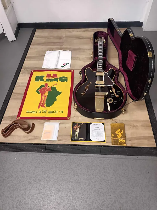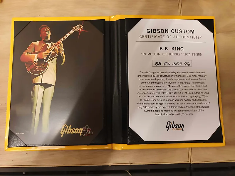 Нет ни одного живого сегодня гитариста, который бы не был под влиянием и не ощущал воздействия мощных выступлений BB King, и, без сомнения, ни один из них не был более легендарным, чем его появление на музыкальном фестивале, посвященном легендарному бою тяжеловесов «Rumble in the Jungle» в Заире в 1974 году, где BB играл на ES-355 1974 года, которую предпочитал до создания модели Gibson Lucille в 1980 году. Эта модель является ограниченным выпуском всего 100 гитар и является теплом данью уважения к ES-355 Walnut 1974 BB, которой он пользовался для Этот концерт. Он оснащен технологией Murphy Lab Light Aging, перламутровыми накладками, звукоснимателями Custombucker типа T, моно-переключателем Varitone и струнодержателем Maestro Vibrola. Также поставляется с множеством «сладостей» в футляре, напоминающих о историческом выступлении на фестивале, а также о легендарном поединке Rumble in the Jungle. В комплект также входит жесткий футляр BB King «Zaire».