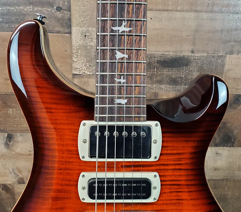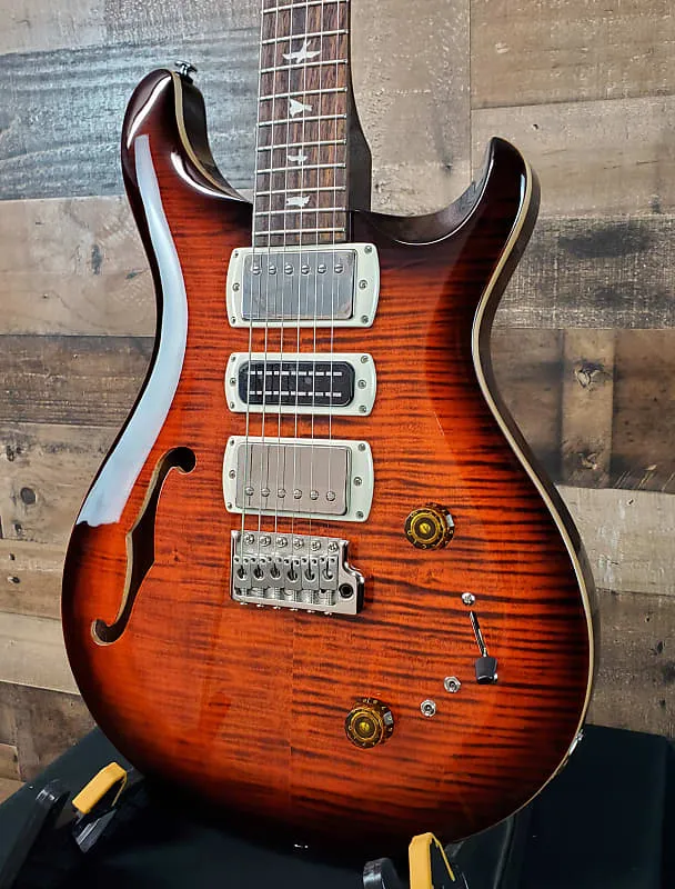 Полуполый корпус с кленовым верхом, задней и боковыми стенками из красного дерева, кленовым грифом, палисандровым грифом, 3 хамбакинговыми звукоснимателями и PRS Tremolo - Оранжевая тигровая