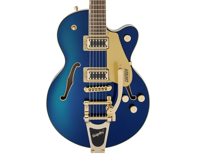 Живые и громкие, гитары Electromatic Center Block Jr. разработаны для чистого и мощного звука Gretsch на высокой громкости. Тщательно созданные с характерным звучанием, стилем и удобством игры Gretsch, эти совершенно новые модели обеспечивают смелую и захватывающую подлинность, которая выделяет Gretsch уже десятилетиями. Это звук самой чести, играйте с гордостью. G5655TG Electromatic Center Block Jr. Single-Cut с Bigsby и золотой фурнитурой имеет корпус уменьшенного размера с полым еловым центральным блоком для динамического резонанса, мощного звука и легкого комфорта. Обеспечивая отличную удобность игры, гриф из лаврового дерева с радиусом 12” оснащен 22 средними джамбо-ладовыми порожками и накладками в стиле NeoClassic. Двойные хамбэкеры Black Top Broad’Tron обеспечивают смелый, динамичный и четкий тон с усиленной звуковой атакой. Эта гитара демонстрирует сценический стиль с тремя потрясающими отделками Azure Metallic и блестящей золотой фурнитурой, включая вибрато Bigsby B70 и закрепленный мост Adjusto-Matic.
